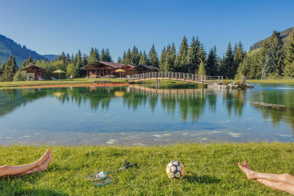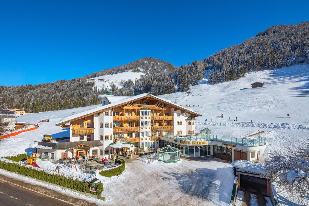 The Apparthotel Talhof is a small 4-star family hotel with an indoor pool, sauna, steam bath, infrared cabin, relaxation lounge, rest room, sun terrace, children's playrooms, and a hotel's own sheepfold with a natural lake, directly on the 300 km hiking network at the sun plateau Roggenboden in the Kitzbühel Alps.